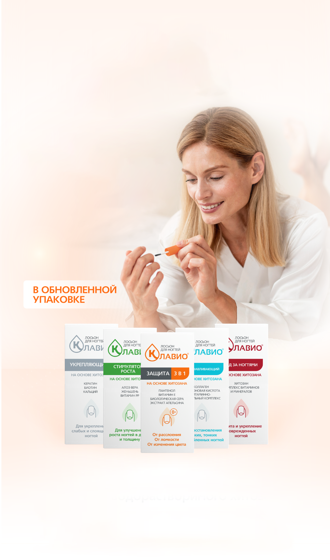 «Лосьон «КЛАВИО®» продемонстрировал эффективность в терапии ониходистрофий, обладает уникальной проникающей способностью на всю глубину ногтевой пластины благодаря водной основе, не содержит спиртов и эфиров, обогащен витаминами и микроэлементами»